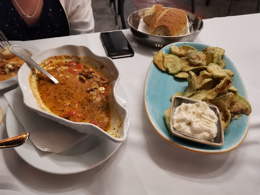 Aufstriche: bestellten Taramas gab es nicht, stattdessen Auberginencreme. Tzatziki fast nur Joghurt, kaum Gurke; kaum Knoblauch. Tirokafteri war recht scharf, lecker und empfehlenswert. Die Auberginencreme war mehr Creme als Aubergine.
