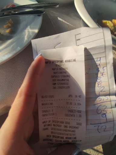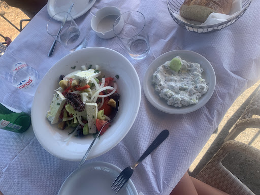 Read moreThe food is of average quality, nothing remarkable, and the portions are quite small compared to other tavernas—especially the sardines, which were almost a joke. Considering the prices, the meal feels rather expensive for what you get. Strangely, after the modest meal, you are offered a huge portion of delicious fried dough balls, seemingly to fill the empty stomach. The terrace hasn’t been cleaned or updated since the 90s, and the toilets are in very poor condition. The owner often appears tipsy, and the place is full of stray cats and large dogs roaming around. On the positive side, the two young waiters do an excellent job and really try to compensate with their friendly and attentive service. And the view over the sea is simply...