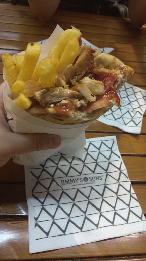 Read moreΤο Jimmys & sons ειναι απτα πιο ωραια μαγαζια των τρικακων για γρηγορο φαγητο. Εχει γυρο τυλιχτα σαντουιτς χοτ ντογκ κλαμπ σαντουιτς κ πολλα αλλα. Οι γευσεις πολυ νοστιμες κ ικανοποιητικες μεριδες για οτι παρει καποιος. Το μαγαζι ειναι ομορφο κ ζεστα διαμορφωμενο ομως ενω εχει εξω κ στο κατω οροφο αρκετο χωρο να κατσει καποιος στο πανω οροφο ειναι πολυ στριμωχτα. Οι τουαλετες καθαρες. Εχει απαλη μουσικουλα κ μπορει καποιος να μιλησει με τη παρεα του. Οι τιμες ειναι πολυ καλες για τη ποιοτητα κ τη γευση που παρεχει. Το παρκινγκ στη γυρω περιοχη ειναι λιγο δυσκολο γιατι ειναι κεντρικα. Ομως στα Τρικαλα ευκολα κινεισαι με τα ποδια η το ποδηλατο. Η εξυπηρετηση ηταν αμεση κ προσχαρη απολα τα παιδια που δουλευουν εκει. Ειναι ομορφο το κλιμα κ αυτο φαινεται. Σας το...