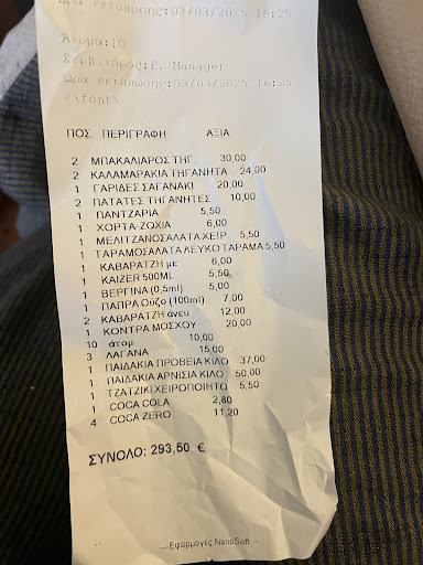 Read moreΗρθαμε να φαμε την Καθαρα Δευτερα στο καταστημα. Το προσωπικο πολυ φιλικο, γρηγορο και εξυπηρετικο, ακομα και στην ωρα αιχμης. Πηραμε να φαμε μια μιξη απο φαγητα, παραδοσιακα νηστισιμα της ημερας και κρεατικα. Το φαγητο ηταν καλο, αλλα αρκετα ακριβο. Συγκεκριμενα πληρωσαμε 15 ευρω για τις λαγανες (δεν αναγραφοραν η χρεωση στο μενου και ηρθαν χωρις δικη μας παραγγελια), 20 ευρω για γαριδες σαγανακι (φρεσκιες, ζουμερες και πολυ νοστιμες αν και το πιατο ειχε 9 γαριδες στο συνολο… ειχε και πιατα με αποψυξτες γαριδες για την ιδια τιμη…) 10 ευρω για 10 άτομα χρεωση (μαλλον για την κρατηση ενω εν τελει ημασταν 8), για να μην πουμε για τα 50 ευρω το κιλο αρνίσια παιδακια… Σαλατες πολυ νοστιμες και στο μαγαζι το τιμανε το σκορδο γενικα! Μας εφεραν και 2 μεζεδακια (μανιταρια και λαχανο τουρσι) με το τσιπουρο. Στο συνολο πληρωσαμε 8 ατομα 293,5 ευρω και στο καταστημα μας...