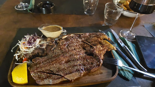 Read moreΉρθαμε Κυριακή του Πάσχα,ήταν ένα από τα μοναδικά εστιατόρια που ήταν ανοιχτά. Εξωτερικά φαίνονταν όμορφο και αρκετά καθαρό.τοτε δεν χάσαμε στιγμή και μπήκαμε αμέσως μέσα. Καθίσαμε στηςαρκετά βολικές μας θέσεις που ήταν στην γωνία. είδαμε το μενού που είχε αρκετή ποικιλία, παραγγειλαμε μία μερίδα μπιφτέκια,μία χοιρινη μπριζόλα,ένα Κοντοσουβλι και μία σαλάτα Οχαλος. Να σημειωθεί ότι η κάθε μερίδα συνοδευόταν με πατάτες ,με μία σαλάτα λάχανο και μία σος μπάρμπεκιου.στην αρχή ήρθαν τα ψωμιά που ήταν φρέσκα και η σαλάτα που ήταν καταπληκτική. Στην πορεία περιμέναμε για 20 λεπτά . τότε ήρθαν οι άλλες μερίδες που τις περιμέναμε πως και πως επειδή πεινουσαμε σαν λύκοι. Οι πατάτες ήταν τραγανες και λεπτοκομμενες όπως μου αρέσουν. Η χοιρινη μπριζόλα φάνταζε ονειρική στα μάτια μας πριν την δοκιμάσουμε. Όταν την δοκιμάσαμε μείναμε με ανοιχτά τα στόματα. Ήταν ζουμερή και πάνω από όλα πεντανοστιμη.το Κοντοσουβλι ήταν επίσης ζουμερό και αρκετά νόστιμο. Τα μπιφτέκια ήταν πολύ αφρατα και καλοψυμενα. 12,5€ έκανε η χοιρινη μπριζόλα που νομίζω πως αυτή η τιμή αντιστοιχεί σε αυτό που γευτήκαμε. 12€ έκανε το Κοντοσουβλι μία καλή τιμή πιστεύω. 10€ τα μπιφτέκια που άξιζαν την τιμή τους σίγουρα.στο τέλος μας κέρασαν κορμό που ήταν επίσης πολύ καλός. 55€ Συνολικά μαζί με δύο κοκακολες. πιστεύω πως ήταν ένα φανταστικό μαγαζί και άμα μπορούσα θα...