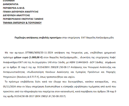 Σας παραθετω και την αποφαση του τμηματος εμποριου και τουρισμου που εκανε τον σχετικο ελεγχο μετα απο καταγγελια και επεβαλε και αναλογο προστιμο.
