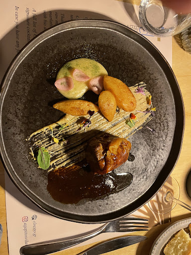 Read moreThis place was a lovely surprise in Pelion where we mostly enjoyed a more traditional cuisine version of tavernas. We’ve appreciated here the more contemporary touch given on the Greek dishes. We have been lucky enough to have met one the members of the family who runs the place, also welcoming and serving restaurant guests. Friendly, patient, with good humour, this young guy guided us through the dishes and drinks. Two starters were to come back to - a fish carpaccio with Pickled fennel / Lemon cream/ Horseradish aioli, as well as their version of bone marrow cooked with Beetroot Gel / Onion crumble / Parsley / Bearnaise. I was also pleased with the mushroomy version of their trachanas (the Greek version of a healthy comfort food). We also enjoyed an indigenous white wine made by a young Greek winery. A Blanc de noir made from 100% Xinomavro and aged for 10 months in new French and American barrels, and in contact with its fine wine lees for 3 months. We have an eye on it :). And of course, the terrace of the restaurant has a charming...