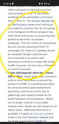 We wanted to sit inside and presented fully valid vaccination certificate, but it couldn't be scanned because it's not an European one, so we were refused a sit and were suggested to sit outside in freezingly cold weather. While the Greek embassy website says: "The Tourism Ministry has clarified by press release that individuals vaccinated in countries that do not belong to the European Certificate program may enter these businesses by presenting their printed or electronic vaccination...