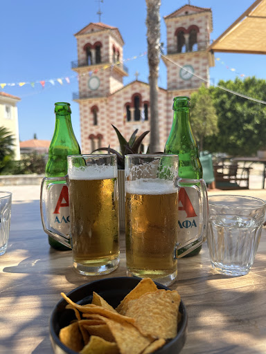 We are staying at Alykes Garden Village. We decided to go on a walk in the opposite direction than the main resort. 10-15 mins up the road, we came to a lovely church that chimed on the hour and the half hour. Opposite the church was a quaint bar. The lady bought a cold glass of water and a bowl of crisps as she was taking our order for drinks. I thought this was a nice touch. Mythos beer 3.50 euros and 250ml of wine 2 euros. A...
