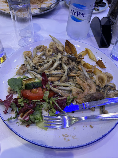Read moreBeautiful taverna with a stunning view, friendly staff, and a great atmosphere. Everyone was being attacked by mosquitoes because there's a stagnant water next door, and a regular gave us some mosquito repellent. I ordered a fish dish and left it because the quality was like frozen from the supermarket. Dry, tough, and tasteless. My wife's too, but it was still edible. For 20 euros, I don't expect much, but I left it. I guess I'm used to better. We saw that the "no smoking" signs didn't apply to the chef. The 2 and 3 picture is fresh from a other taverne same price, we know...