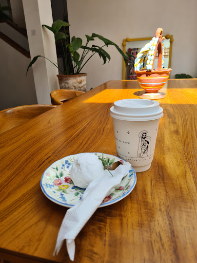 Read moreThis place is ranked at 4.4, but bumped up to 5 for decor and other factors. We were referred to this cafe often by fellow baristas. So, paid homage to this newer but highly respected roastery and cafe. We ordered our usual cappuccino for Q19 (12oz) - fees are a bit higher than other cafes. The cappuccino is served along with rosemary infused water. The cappuccino's espresso has a subtle but fragrant and sweet roast.The cream used was less creamy, but strong enough to elevate the espresso's taste. Now, less talk decor - this place is gorgeous and clearly appreciates continuity of theme. Their colour palette is gold, white, neutral wood tones, and velvet pink with blue. Very stylish and beautiful cafe. WiFi is strong. No AC. Coffee beans are on the high side - Q80 for...