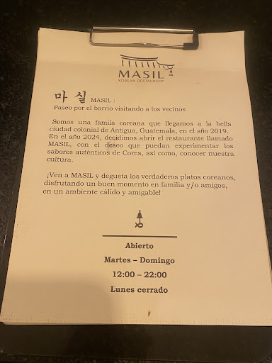 Read moreMy first Korean meal! And if I lived in Antigua I would be returning. We’d walked past Masil couple of times on the five-minute walk into town and noted that it was busy. So we went around 8pm as people seem to eat early in Guatemala. Still busy with no tables free and a threesome ahead of us… Happily the lady in charge was friendly and accommodating. She proposed we sit at the bar and I’m glad we did: on the other side was the tiny kitchen with the chef working his magic - good ‘restaurant theatre’. Even if a table had come free we’d have stayed put. Our food came in a timely manner and was delicious. I liked particularly the pork dumplings. The vegetarian ones went down equally well at the other end of the bar. Plenty of room behind us so we three were able to talk comfortably. And next to me we had the unoccupied fourth bar stool (where they pass things back and forth and keep menus) on which to put our bags and coats. They’re making quite a success of their new restaurant and I...