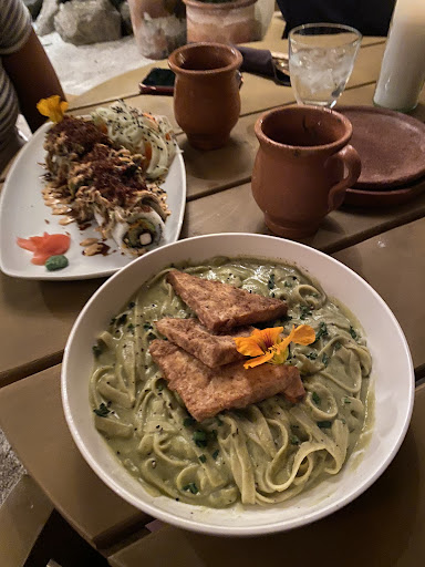 Read moreAs a vegan for 6 years , I really wanted to love and support this place. While service is polite, I first visit with my partner and the complimentary soup was the best part of our meal. I had the enchiladas half green and red sauce. For the price they charge it should come with more than just soy crumbs inside the tortillas, it was also very dry. The ceviche was more like a tomato salsa, no lime flavor. We decided to give it a second chance thinking maybe we ordered the wrong things. The cauliflower wings were excellent, but I ordered onion rings for 50 q and received 5 onion rings on a huge plate. Mac and cheese was too intense smoky flavor where you can only eat so much before wanting to put the fork down. Before ordering the fettuccine the waitress warned me the plate would be spicy. I love spicy and the pasta had no spice or flavor, the dish was 84 Q. Springs rolls were mediocre at best. The "hash brown" was a dry hard waffle almost. The best part again was the soup, the dips were good and the cauliflower is all I would consider to go back for. For as much as they charge for a plate there is much variation and flavor lacking. They should really consider adding veggies to enhance the plates that only come with bland tofu as a meat substitute. Absolutely not the best vegan...