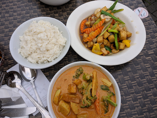 I had chicken Penang, flat bread and coconut rice. My daughter has stir fry tofu, veggie gyoza thingeys and rice too.