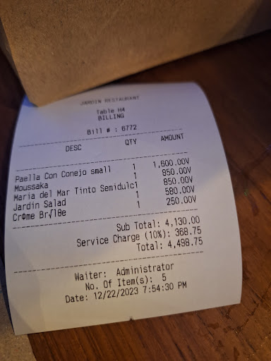 Food - wide variety of Mediterranean dishes. We had Moussaka, Paella with rabbit, house salad, a bottle of wine, and we all shared the creme brulee. It was our first time having rabbit meat and only when it arrived at our table did it come to our minds that it was a rabbit. (It was a bit tough) but the paella was good. Tomatoey. We loved the moussaka, too. We weren't able to finish it. One order of moussaka can be shared by 6 people if you're ordering other dishes. House salad was also good. When we had enough of the rabbit meat and moussaka, we ordered the salad. Right amount of dressing. And the dessert was silky smooth. It was recommended by a friend. His words 'it's to die for'. The bottle of wine helped us, somehow, to finish the food we ordered. We took the bottle home cos we weren't able to finish it either. As I've said, a challenging and memorable dining experience at Jardin.