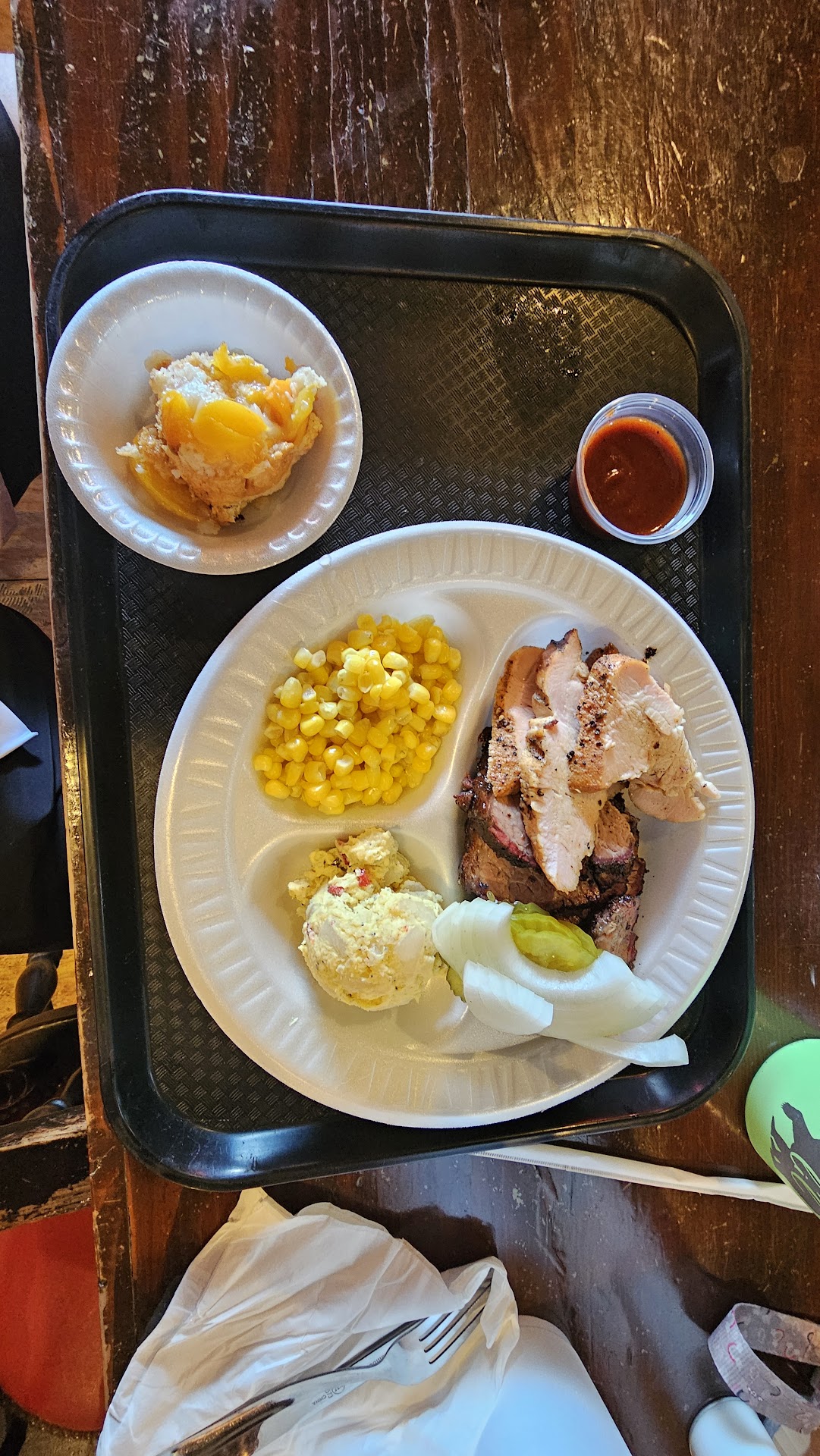 I ordered the two meat plate with brisket and smoked turkey. They had two options for potato salad a traditional version and a Texas version, I decided to try the texas version. I also selected their corn and was pleased to find out that a peach cobbler was included with the price of the meal.