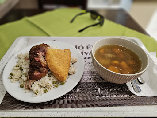 Read moreÜdv. 8 évig egy másik helyi étterem ételeit ettem. Az ok nem fontos, fél éve átpártoltam a Kornélia Bisztróba. Hatalmas előny, hogy látom mit és mennyit kapok az általam kiválasztott ételből! Békéscsabai viszonylatban az árai sem térnek el a többi étterem áraitól, azaz megfizethető. A személyzet kiválóan gondoskodik a jó hangulatról és a jó étvágyról! Közvetlenek, kedvesek és van humorérzékük is! Az üv. Stephan Rostás gondoskodik róla, hogy jó hangulatban teljen el az ebédidőd!🙂 Az ételek háziasan finomak, változatosak, és még a diétázók sem maradnak éhesen. Hűséges vendégük lettem és az is maradok! Ha Békéscsabán jársz és ebédelni szeretnél, feltétlen próbáld ki a Kornélia Bisztrót! Garantáltan nem maradsz éhes! Summa summarum, én 5-nél sokszor több csillagot adok ennek a helynek! Jó étvágyat...