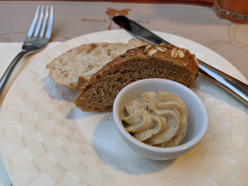 FOOD For the start we got 2 complimentary slices of bread with pesto-butter. This was a nice litte appetizer. We had had 2 Main dishes: the roast duck and the Venison stew. The stew had a very heavy and intensive red wine taste. The meat was great and very tender at all. But on the other side, the duck with cholent was only okay an nothing special at all. The plate was really clean and i missed some sauce for the duck as well.