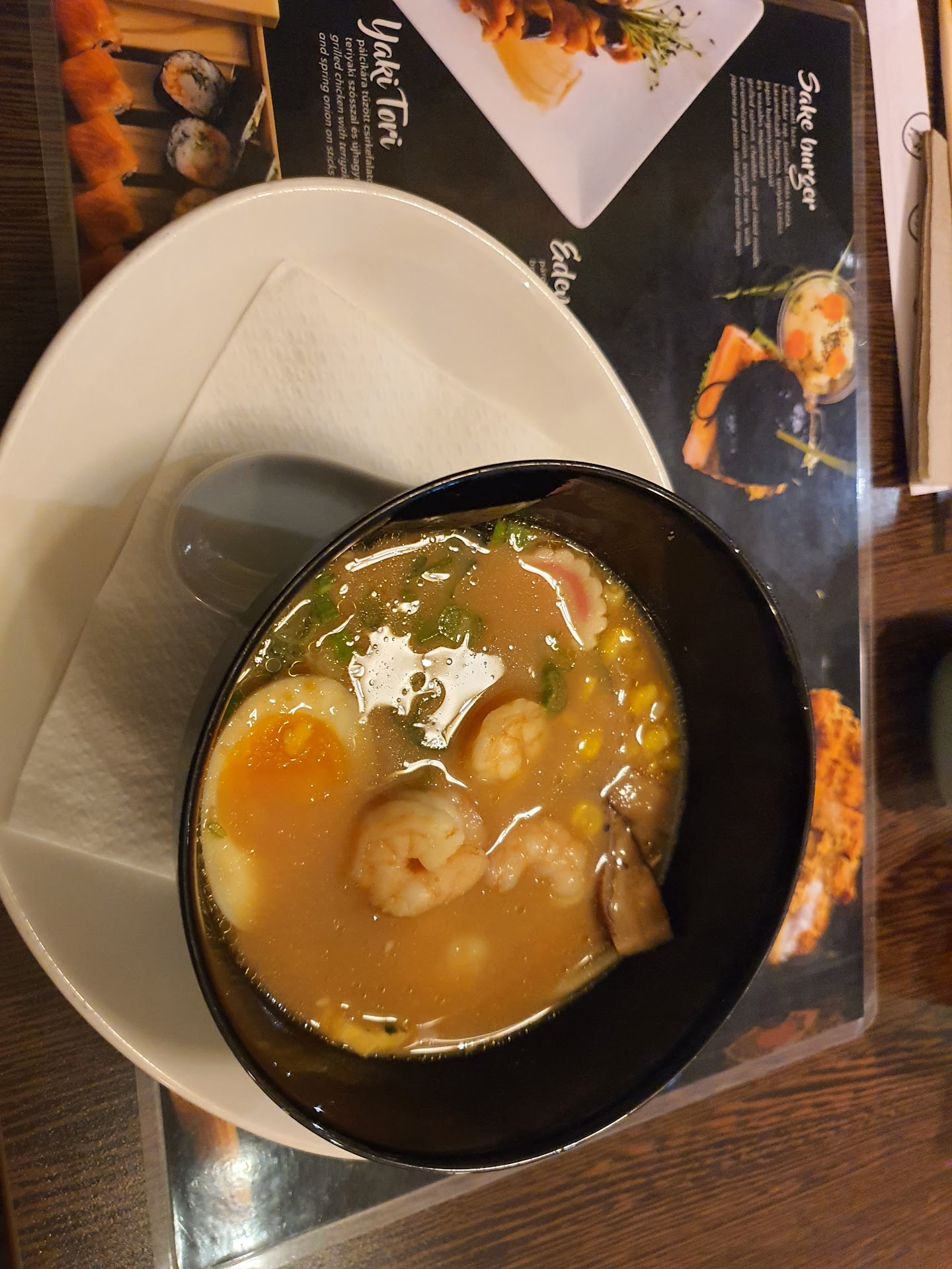 We got no wasabi and had to ask for it. We didn't get our own plates, which means that we had to use our soy sauce bowls as "plates" to prevent the soy from dropping down on the table. On the tables there are greasy flat menu cards that you have to look at while eating (and supposedly use as plates?)