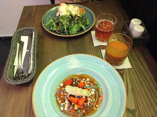 The prices are relatively affordable compared to similar restaurants, but the portions are on the smaller side. While this might be expected for the price, it’s worth noting if you're looking for a more filling meal. I ordered the American pancake, but it resembled more of a traditional "palacsinta"—thin and quite small. Despite its size, it was generously filled with cream, which some might appreciate, though in my case it was overly sweet. I ended up scraping off most of the cream to make it edible.