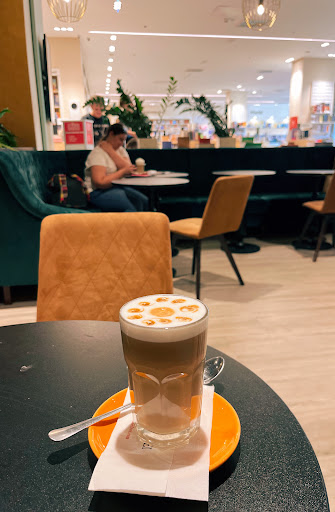 Read moreI come here quite often to work or to read. I love this little corner in a bookstore where delicious and a huge variety of coffee can be served, mixing with the smell of the new books. There is this cool background noise that is very topical of a bookstore. Prices are great; the coffee you see in the picture ( Costa Ricai Coconut Macchiato) was 1150Ft. Vegan and dietary cakes are...