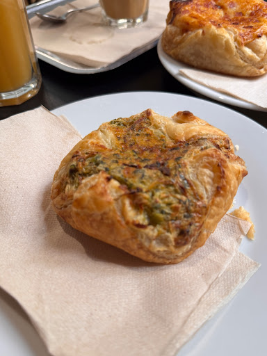 She was very friendly, with a modern haircut and a constant smile. She patiently explained the different savory pastries. We ordered a Flat White (950 Ft ≈ €2.4), an orange juice Rostos Toma 0.33L (590 Ft ≈ €1.5), and two savory baskets: the Mediterranean (650 Ft ≈ €1.6) and the cheese & ham basket (650 Ft ≈ €1.6).