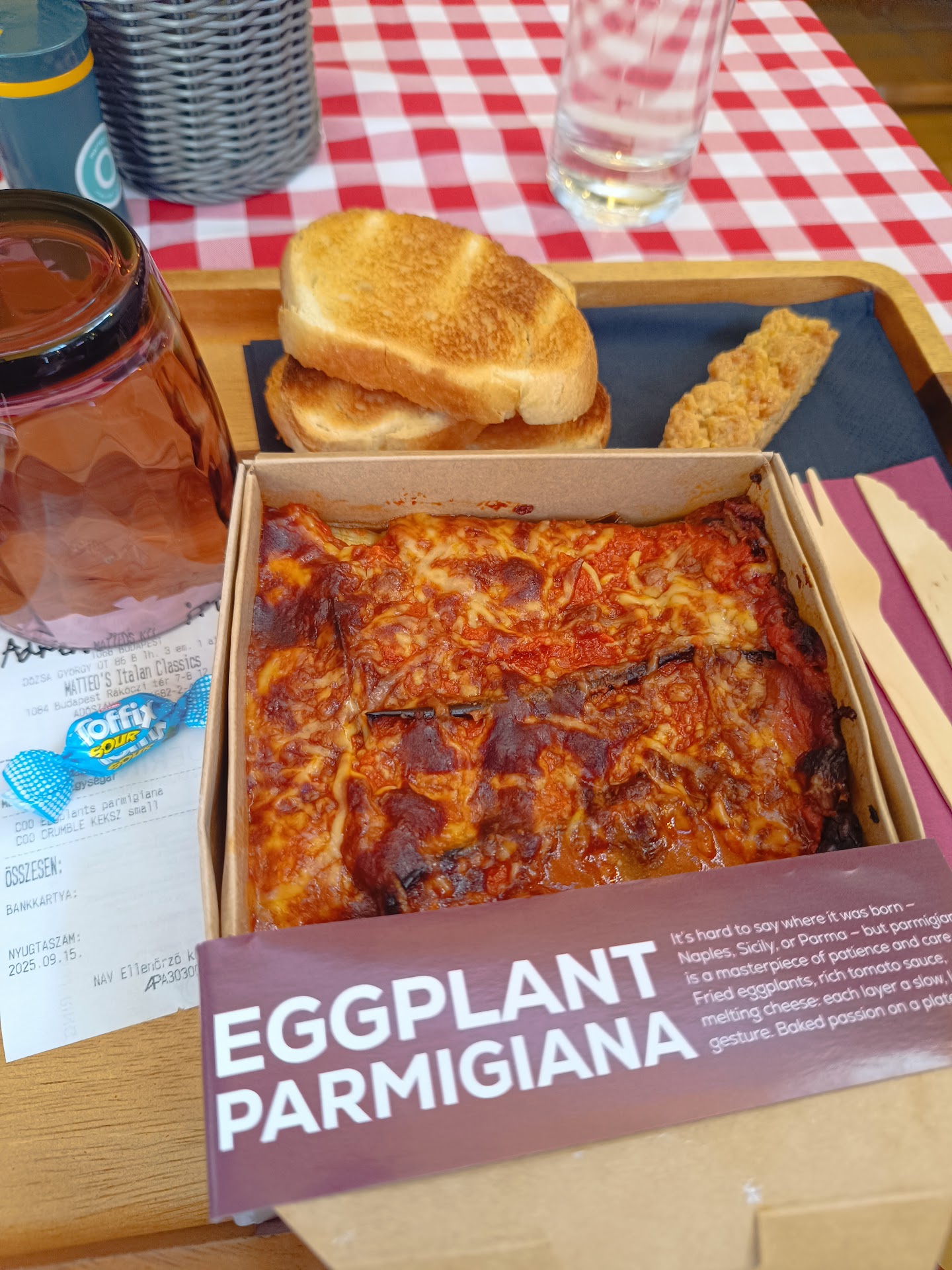 Read moreAs I was entering Rákóczi Market, I noticed a new place had opened! I went to check the menu out of curiosity, and the Melanzane alla Parmigiana immediately caught my attention, so I ordered one to take away.