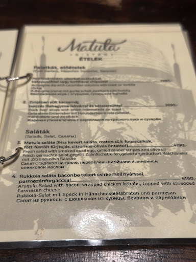 Read moreWe have recently been staying at the hotel opposite this particular Bistro & due to it's popularity we struggled to get a table in the first instance. I have to say it was one of the best meals we had whilst being in the capital (the other being a pizza place just round the corner on the main road!) The food at Matula was perfectly cooked & presented and with such a wide variety of dishes on the menu; it was really difficult to make a choice. I started with baked camembert ( which really was a meal in itself) followed by a grilled trout. The trout was marginally overcooked, but still delicious. The previous day I'd enjoyed the catfish at the bistro - huge pieces of flavoursome fish cooked in a light coating. They had a wide selection of cocktails and other alcoholic drinks (including an array of palinkas) at very reasonable prices. We paid approximately £17 for a hearty, homemade 2 course meal with a drink. Excellent value and I'd have happily returned again for the 3rd...