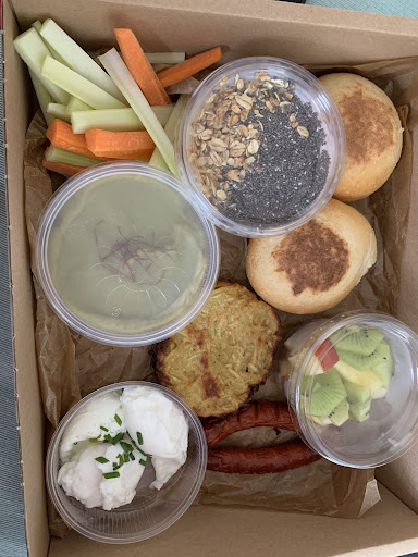 I order the 9 elements box with 2 poached eggs, 2 English muffins (homemade), 2 hash browns, 1 Tropical smoothie bowl, 1 cup of fresh fruit, avocado cream, cream cheese, and sausage.