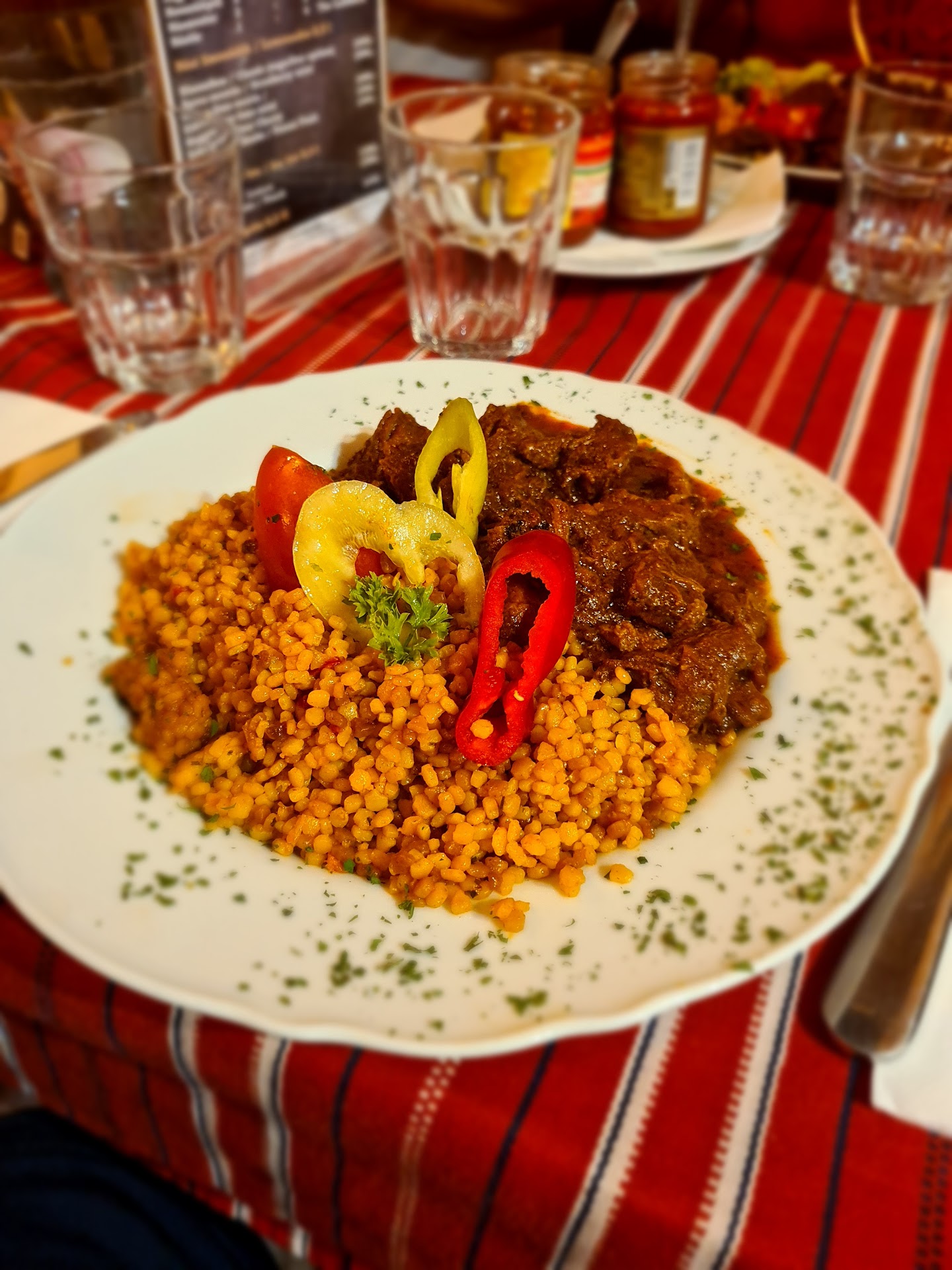 The stuffed cabbage appeared to be just that; what looked like an entire cabbage reduced to its expansive leaves and stuffed full of yummies and covered in more yummies....and beyond the bounds of contemplating finishing it all. The beef stew with egg barley (which is what I had), I just about managed to finish, though after we left, transport other than walking (a wheelbarrow perhaps ?) would have been gladly accepted.