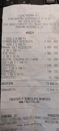 Read moreAz étel nagyon finom volt. De ott voltunk 1 óra 35 percet úgy hogy az evés körülbelül 15 perc volt. A leveset el felejtették helyette a fő ételt hozták 40 perc elteltével. Mikor szóltunk hogy volt leves rendelésünk nagyon sajnálta. El is vitte a fő ételt mondta hogy frissen hoz másikat. A leves utána 5 percre jött is. Meg is ettük gyorsan itt kb 55 percnél jártunk. Utána a pincér mondta kedvesen hogy hozzák a fő ételt. És itt jött megint a nagyon sok várakozás kb 30-35 perc. Mikor ki jött a tál burgonya helyet rizs volt rajta… mondta a pincér nemsokára hozznak hozzá burgonyát ( elsőnek ugyan ez a tál jött ki amit el vitte ott jó volt burgonya volt a tálon. Nemsokára rá ki is jött a burgonya és a másik tál is. Meg ettük ezt is 5-10 perc allat. Îgy kajával kb 10-20 perc között volt a várakozzásal meg ennek az időnek több mint a 3x. A fizetésnél kérdezték minden rendben volt ? Mondtuk hogy nem nagyon sokat kellet várni, és a köretet is el rontották. Itt vártuk hogy mondja hogy nagyon sajnáljuk kérem legközelebb is jöjjön el hozzánk ne ítéljen meg ez alapján. De erre a pultos el kezdet mentegetni magukat hát igen várni kellet kicsit össze keverte a kollega. De a tálat azért hozták ki rizzsel krumpli helyet mert alapból így van … de mint korábban írtam elsőnek jól hozták ki amit kedveségből vissza vittek hogy frissen hozanak másikat. Itt csak anyit válaszoltam rendben kártyával fizetnék el köszöntünk...
