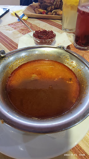 Magam halászlevet harcsával és belsőséggel kértem, tűzforrón bográcsban tálalták friss fehér kenyérrel, és erős paprika krémmel.