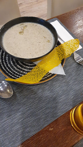 Read moreGusto az első étterem látogatásunk Gyulán. Hangulatos stúdió étterem kevés asztallal, de a székek, kanapék borítása már a fakult eleganciát tükrözik. Nagyon jól nyitottak a szarvasgombával fűszerezett vargánya levessel, parmezán chipssel. Ha a chef ajálataként az étlapon van, szerintem kihagyhatatlan. A jércemell két ételünkben is szerepelt ami szárazra, szálasra sült az éttermi kések nehezen fogták, ez ezen a szinten kissé furcsa. Kéksajtos, sült almás jércemellnél váltotta egymást az az érzésem, hogy nagyon jó és majdnem jó. A natúr hatású sült alma még elbírt volna egy kis plusz édes fűszeres ízt, de a kéksajt mártás izgalmas, a krumplipűré pedig jól kíséri. A mozzarellasajtos csirkébe belekóstoltam, azt biztonsági ételként rendeltük a gyerek miatt, de az nyugodtan kihagyható. Népszerű ételnek látszott még a piros gyümölcsös chutney-val kísért húsétel, több asztalnál is láttam ilyet, a vendégek pedig elégedettnek tűntek, látványra kellemes volt, legközelebb kipróbáljuk. Télen látszik, hogy félgőzzel fut a kínálat mert a háromféle csapolt sörből csak a borsodi volt elérhető. Azért figyelmes volt a személyzet mert amikor hallották megemlíteni a meggysört udvariasan szóltak előre, hogy csak borsodit tudunk kérni. Mellékelt képen az említett leves, azt mindenkinek ajánlom, aki egy kicsit is kedveli a szarvasgombás ételeket. Ízletes, és nagyon hatásos a megjelenés. A többi fogyasztott ételről sajnos nem tudtam ilyen...