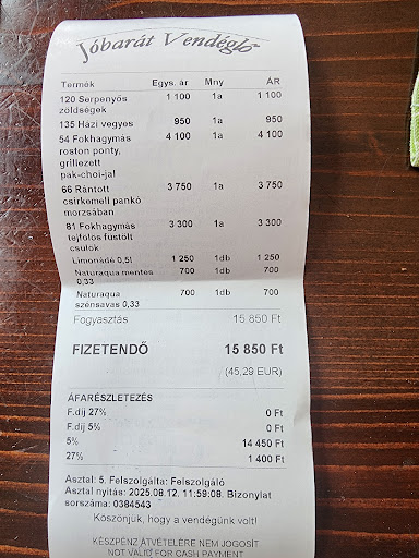 Read moreReasonable service, decent atmosphere, really quite bad food. We chose this place because it was our last night here and we wanted to eat traditional Hungarian. The menu was interesting, but the food was really quite poor: fish grilled with a faint taste of paraffin, over-salted with lumps of salt in the sauce. My child’s dish was so salty they couldn’t eat it. My other son was given oven chips with his. Even the beer was a bit warm. Honestly I sound like I’m being overly fussy but it was it’s such a shame. Maybe it’s because it’s the end of August, maybe it’s because we arrived late and they were tired. But it wasn’t...