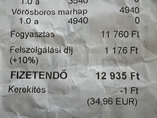 REAKCIA NA KOMENTÁR VLASTNÍKA Keďže nie je možné reagovať priamo na Váš komentár, robím to cez úpravu mojej recenzie. Recenziu som napísal v auguste, kedy som navštívil Vašu reštauráciu, dnes som v nej len upravil niektoré formulačné nepresnosti, a preto sa recenzia zobrazuje ako dnešná. Ale aj keby som bol u Vás dnes...Vy si odkladáte pokladničné doklady z reštaurácií? Preto, ak ma považujete za klamára za to, že nemám blok, to je Váš problém. Najlepším dôkazom toho čo som napísal je niekoľko iných recenzií od ďalších ľudí, ktorí tu o tejto nekalej praktike písali (v prípade potreby Vám sem tie komentáre rád skopírujem). To že pokladňa má byť nastavená podľa kurzu na dverách je absolútne zavádzanie a lož. Pokladňa má byť nastavená na maďarský forint, v ktorom má byť naúčtovaná platba na pokladničnom doklade, ako aj na platobnom termináli a o konverziu (a kurz) sa má postarať banka a nie Vy. Pravda je taká, že na termináli svietila suma v EUR a aj doklad z terminálu bol v EUR. Znamená to, že keď platí Maďar s maďarskou platobnou kartou, tak tiež bude mať na termináli sumu v EUR prepočítanú nevýhodným kurzom a z jeho maďarského účtu mu nebude stiahnuté toľko, koľko podla jedálneho lístka malo byť stiahnuté? Teda ktokoľvek platí kartou, tak nikdy mu vlastne nie je naúčtovaná skutočná suma v HUF, aká mala byť? Alebo nebodaj rozlišujete na národnostnom princípe, že Maďarom účtujete v HUF a Slovákom nevýhodne v EUR? Suma sumárum, niekto si rovno naúčtuje sprepitné na pokladničný doklad, ako to robí Sári Csárda a niekto iný má na to "šikovnejší" spôsob.