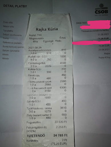 REAKCIA NA KOMENTÁR VLASTNÍKA Dnes som náhodou pri upratovaní auta natrafil na účet z mojej návštevy tejto reštaurácie a na žiadosť vlastníka, ktorý ma vyzval na jeho predloženie, tak robím. Bohužiaľ, nenašiel som doklad z terminálu, na ktorom bola suma iba v EUR. Ako dôkaz predkladám výpis z účtu, kde je jasne vidieť, že mi bola strhnutá rovnaká suma v EUR, ako bolo prepočítané na účte - nevýhodným kuzom 1EUR = 325 HUF a nie skutočným kurzom v daný deň 1 EUR = 349 HUF. Z toho jasne vyplýva, že o konverziu sa nepostarala banka, ale reštaurácia, ktorá platbu naúčtovala do terminálu v EUR a nie v HUF. Takto sa cena navýšila o 8 %. Túto nekalú praktiku tu kritizovalo už niekoľko zákazníkov a reštaurácia na jednu recenziu reagovala, že používa forint terminál a v prípade platby kartou nenastavuje kurz. Ide o čisté klamstvo - používate EUR terminál a o konverziu sa staráte vy nie banka. So zhrozením som navyše až dnes po 2 mesiacoch zistil, že reštaurácia si bezočivo naúčtovala aj automatické 10 % sprepitné. Skutočná cena sa tak navýšila zo 64,55 € na 76,26 €, teda o 18 %!!! Každý zákazník teda musí počítať s povinným sprepitným 10 % (bez ohľadu na spokojnosť s obsluhou) plus 8 % maržou za vynútenú a nevýhodnú konverziu meny reštauráciou. Túto reštauráciu odporúčam...