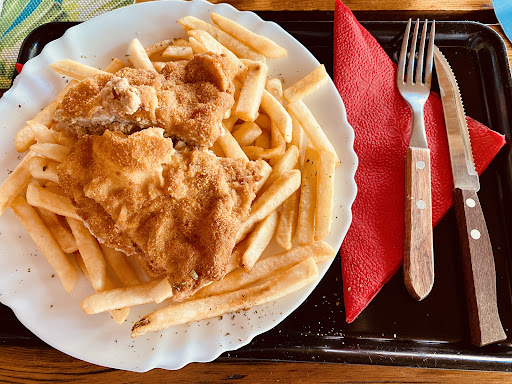 Nice biker and Lokal hero’s Restaurant with Hungarian 🇭🇺 food and outside / inside places. Not to forget the paprika on table, try it! 😊 Pork steak like Vienna Art with inside pork brain was very delicious. Fast food of course, but Hungarian styled. The Giros was good too, special type of Lokal food. No one speak German or English 😆, therefore I used Dr. Google Translator for the girl waiter and the menu too 😊 the four stars are for fast food restaurant! The burgers 🍔 are small for Hungarian...