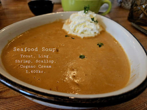 A very short menu. Nevermind, we were of positive spirit. We got some bread wuth butter but no plates... must be a thing to enhance communal spirit. We ordered seafood soup and cauliflower puffs. The seafood soup was a thick cream brown fluid. We tried to fish the few pieces of seafood. On top was a spoon full cream. Very old fashioned understanding of a fish soup. Heavy cream soup "velute" its a thing of the last century. The cauliflowers arrived brown from old frying oil. Too soft the inside too burned the outside.