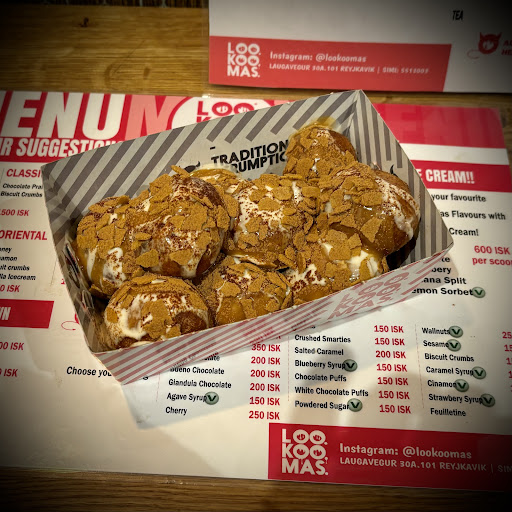 As an American who annually attends a Greek Food Festival in my city, I am no stranger loukoumades, the luscious Greek doughnuts that are one of my favorite treats I don’t get to indulge in often enough. Therefore upon my vacation arrival to Iceland, as soon as I spotted Loo.Koo.Mas. I knew I had to try them… Well tonight I did. These are hands down the BEST loukoumades I have ever had! While totally sinful and decadent, they aren’t overly sweet (in the US we would ruin these by making way too sweet). The fried dough is golden on the outside and pillowy on the inside, made even more delicious by topping choices that add a variety of flavors and textures. On the menu are suggested topping combos, but I opted to “Create My Own” with salted caramel sauce, cinnamon and feuilletine (crispy flakes made from thin, sweetened baked crêpes. One of the delightful (and snappily dressed) owners suggested I add a drizzle of vanilla cream (which is what I would call a crème anglsise) and he could not have been more right. Not only did it make for a prettier presentation, but it balanced the other flavors perfectly.