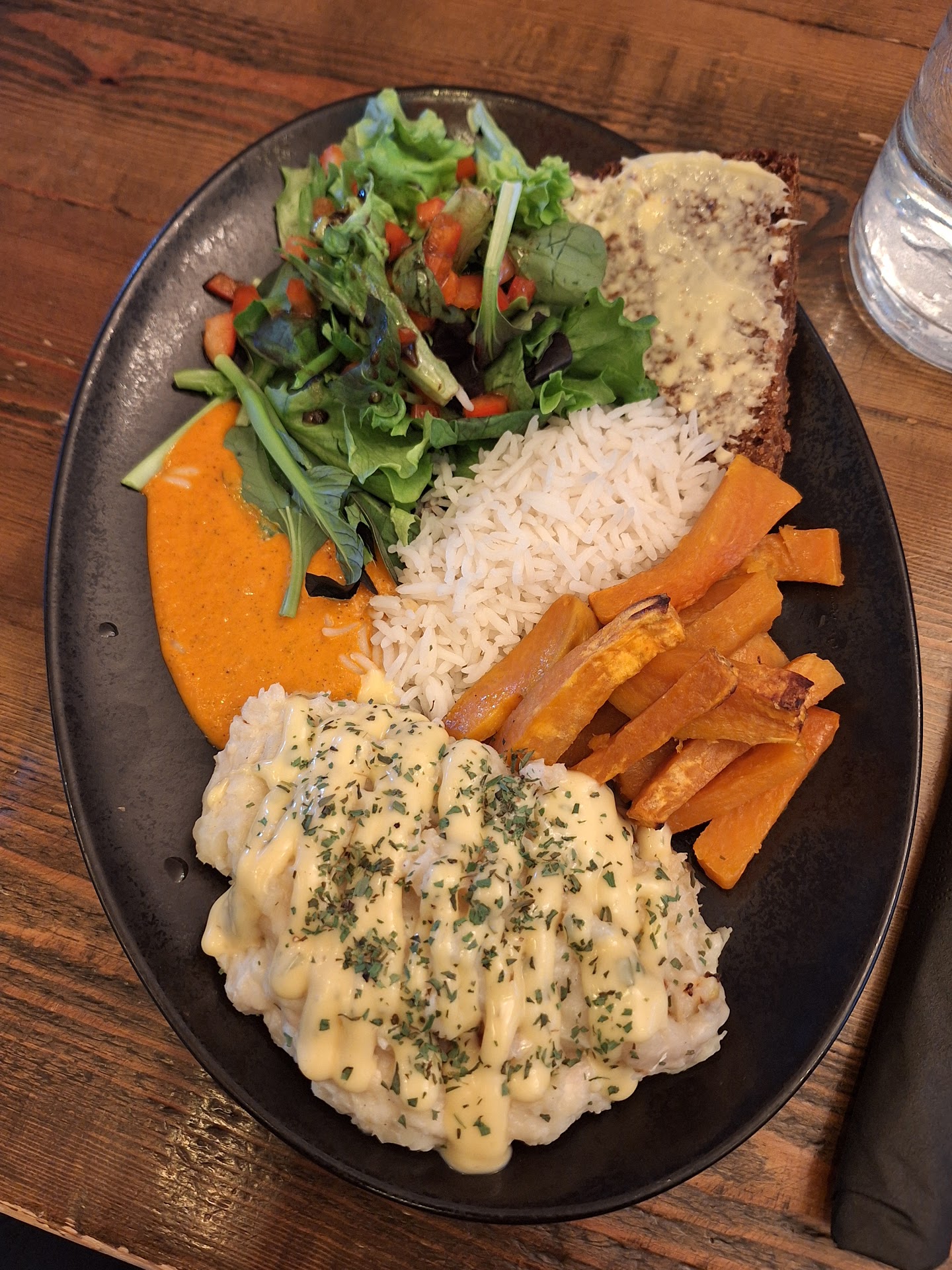I ordered the PLOKKFISKUR (fish stew, 4300 ISK) and loved it! Haddock and cod were mashed with potatoes and topped with a creamy Bearnaise sauce. To me, it tasted like clam chowder, which was such a pleasant surprise! It had a smooth texture with some lumps and I only found one fish bone. The plate also included a scoop of Basmati rice, sweet potatoes, small side salad, rye bread with butter and a dollop of paprika ginger sauce. The sauce added a bold bright flavor and the sweet potatoes were natural and delicious. I enjoyed the sweet rye bread which went perfectly with the salty butter. For 4300 ISK, this was a hearty and well-rounded meal.