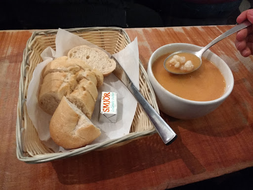 The LOBSTER SOUP itself was pretty flavorful with bell peppers infused in what seemed like a seafood broth. Unfortunately, the lobster pieces were so mushy! I didn't even have to chew the lobster; it basically just disintegrated on my tongue which was kind of concerning. Based on a Google search, mushy lobster could mean that it was not fresh, or not handled properly, such as possibly being thawed and refrozen multiple times. We really enjoyed the bread which had a crisp chewy exterior and pillowy center, only made better by a dab of the smooth Icelandic butter or a dip in the soup.