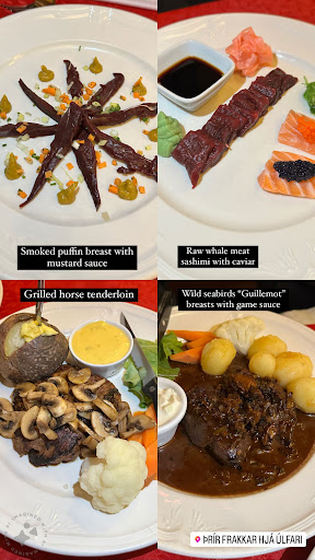 We had raw (sashimi) whale as our appetizer along with smoked puffin breast. The raw whale tasted like iron, liver, and tuna if it was mixed together. The puffin tasted like smoked salmon. I also had the creamy mushroom soup, which was very very creamy and delicious!!