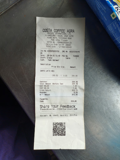 If youâre in Agra and looking for a place to unwind with loved ones, Costa Coffee is a must-visit. Delicious coffee, great service, family-friendly setupâand if you're lucky, maybe even a festive discount...