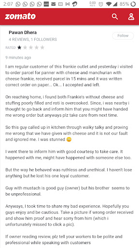 I have written a review about them on Zomato. You can read this in the snapshot shared. Unpleasant experience yesterday not only because of wrong order received but also because of ruthless and unprofessional behaviour by the order taker.