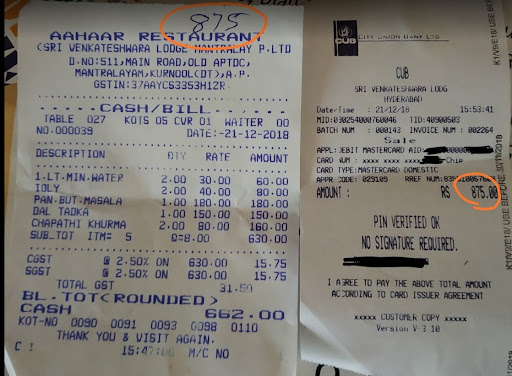 Billing was surprising. Most of the items were wrongly billed. In the bill we see that he has charged Rs 80 for 2 chapatis which is mentioned as Chapati Kurma. Upon questioning where's the Kurma?. The waiter says we have to ask specifically for. So "we didn't ask & so he didn't give" concept. 2 plates of Idli were billed whereas we had only 1 plate. The bill showed Rs 662/- . 2 items delivered were missing in the Bill. When asked he says bill is wrongly printed, but the actual amount is Rs 875/- which is handwritten on the bill. I don't know whether these kinda mistake was bonafide or malafide? Hope Management takes care of these kind of issues of...