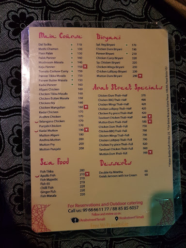 Arab street.......it's restaurant in Tenali . Arab street offer all varieties of food such as starters,biryanis, ice-cream etc . The one New thing in this restaurant is seating . Here we can have tabels as in normal manner and we have cot also . This cot is also used for dining purpose especially for large scale of food . Arab street offer biryanis in different style like providing big basket nothing but big plate that two people can have their food . Another dish is there that full Biryani that is 7 persons can have their food . The price of that is 780 and half Biryani is 400 . The service is good when compared to another hotels . Bell is given and if we ring the bell then waiter will come . Sea food is also available here and we can have our food at down also if the count is in huge number . Finally the hotel deserves average talk and food is delicious and my suggestion is that quantity of Biryani should be increased......and all the other this are good and inside atmosphere is also very nice....and" I have posted the menu also u can check prices of all the dishes Available in...