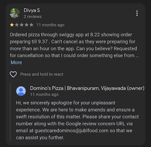 I suggest avoiding Domino’s, especially the Bhavanipuram branch. The call manager, did not respond properly even after we visited the counter and raised our complaint. We were very disappointed with the overall experience and have decided to boycott Domino’s and its services in our apartment going forward.