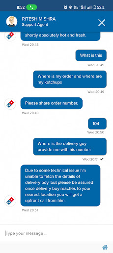 Read moreThis is the worst domino's branch ever few months back they didn't provide me with my toppings i order, I called the delivery guy and the manager said sorry and he would add toppings for my next order for free , now I ordered another order with ketchup i didn't receive ketchups and again after an hour i ordered a pizza and hour ago still the delivery executive is not assigned and i didn't receive ketchup again now they are saying they will pay me money for my ketchups! How unprofessional is this dominos branch when someone cannot run this brand why does dominos letting them run this branch , I am not a guy who writes reviews so please take this seriously Dominos this branch is spoiling...