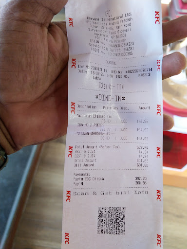 Read moreNo staff I waited in counter to place order for more than 5 mins Only one customer sitting in dine in area AC was switched on only after 2 customers insisted to switch on Two staffs without uniform were going around Manager was not around Order was taken only after I asked She was not trained on order taking Ordering process was slow Card payment option was not available Upi QR Code didnt Get generated Manager came very late and handled POS machine and EDC machine in front of customers with breading in hand 🖐️ We can understand he came halfway doing breading Work Bill was not provided After 10 mins food was given. I felt something bad about the chicken in burger but I ate it. Same foul taste came in fried chicken also So I left it without eating Went to counter three staffs chatting didnt bother to ask why I came to counter... Called one of them and asked for bill.. She never had them... She searched.. I told the value 392.,but she gave me a 601 rs bill... I understood They are making multiple orders together and making billing. Then I informed the staff about the foul taste.. She immediately took the chicken in my plate and threw in bin. Manager was again vanished. Left the place with feeling bad for the brand that once ruled fast-food business in...
