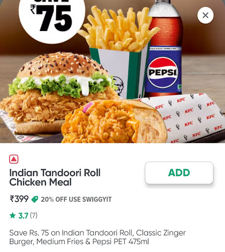 The other cashier logged into my zomato account on his device and added it to the cart, and said i am gonna get medium popcorn for free which i couldn’t understand. Then he started to explain, I had to pay a delivery fee of 70 rupees for dining which doesn’t make sense and since i would be paying 70rs extra they are gonna add 70rs from their pockets and give me medium popcorn for free. I asked if I didn't need extra popcorn and would you give back my delivery fees since I walked into the store for dining, for which he said NO, he won’t refund the delivery fee. Next I asked what is the cost of the mingles bucket which he is ordering online, it’s 440rs that is 100rs more than what KFC menu says (339 rs).