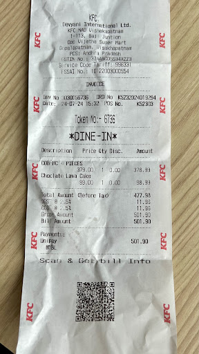 Ā Ā Ā Read moreWORST .. PATHETIC.. I HAD ORDERED FOR POPCORN CHICKEN BIRYANI AND I GOT ONLY BIRYANI WITHOUT POPCORN AND ON TOP OF THE PACKING WAS NOT DONE PROPERLY . WHEN ASKED THE DELIEVRY SWIGGY PERSON , HE SAYS KFS PAKCING IS ALWAYS LIKE THIS . THE OUTER PACKING WILL BE THE PAPER COVER WHICH IS TAPED WITH THE KFC STICKER . EVEN A NORMAL RESTAURANTS GIVE THE BIRYANI BOX PAKCED TIGHTLY. IT WAS SO LOOSE .. THE NUMBER MENTIONED IN GOOGLE WAS ALSO IS NOT CORRECT AS PER THE OWNER OF THE NUMBER SAID. THE SERVICE PERSON FROM THAT KFC RESTAURANT ALSO AFTER LISTENING TO THE COMPLAINT , THEY DISCONNET THE CALL AND KEEP THE MOBILE IN SWITCH OFF . SO YOU CAN UNDERSTAND WHAT KIND OF FOOD BUSINESS AND SERVICE THEY ARE INTO. ITS COMPLETELY CHEATING . THE MATTER IS NOT INR 300 OR 500 . ITS CUSTOMER SERVICE AND AFTER SALES SERVICE.. WHICH IS ZERO . I WILL TAKE THIS MATTER VERY SERIOUSLY AND RECOMMEND EVERYONE TO CHECK THE FOOD PACK BEFORE ACCEPTING N...