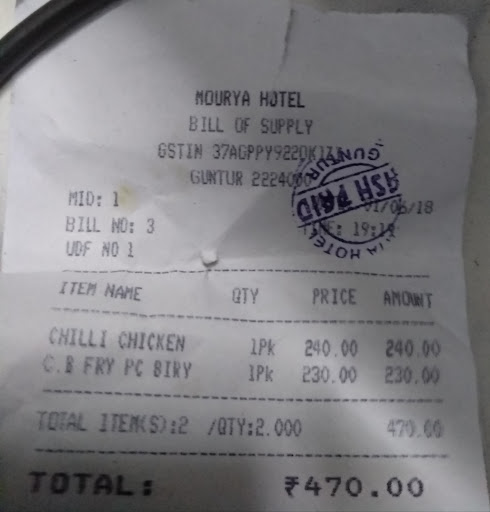 Mourya Hotel - I visited this hotel on a couple of occasions and had different breakfast items - Idly, Vada, PLain & Masala Dosa, Uthappam Parotta (evening time). Decent hotel taste wise but the ambience is not great. Special mention to the Masala Dosa - which is of great taste compared to the other tiffin items - fulfilling for a person upto Lunch time - since it contains good mixture masala of Potatoes; Carrot; Cashew etc. Owner needs to concentrate on the cleanliness and walls look of the hotel and try to modernise it - however without increasing the prices later...