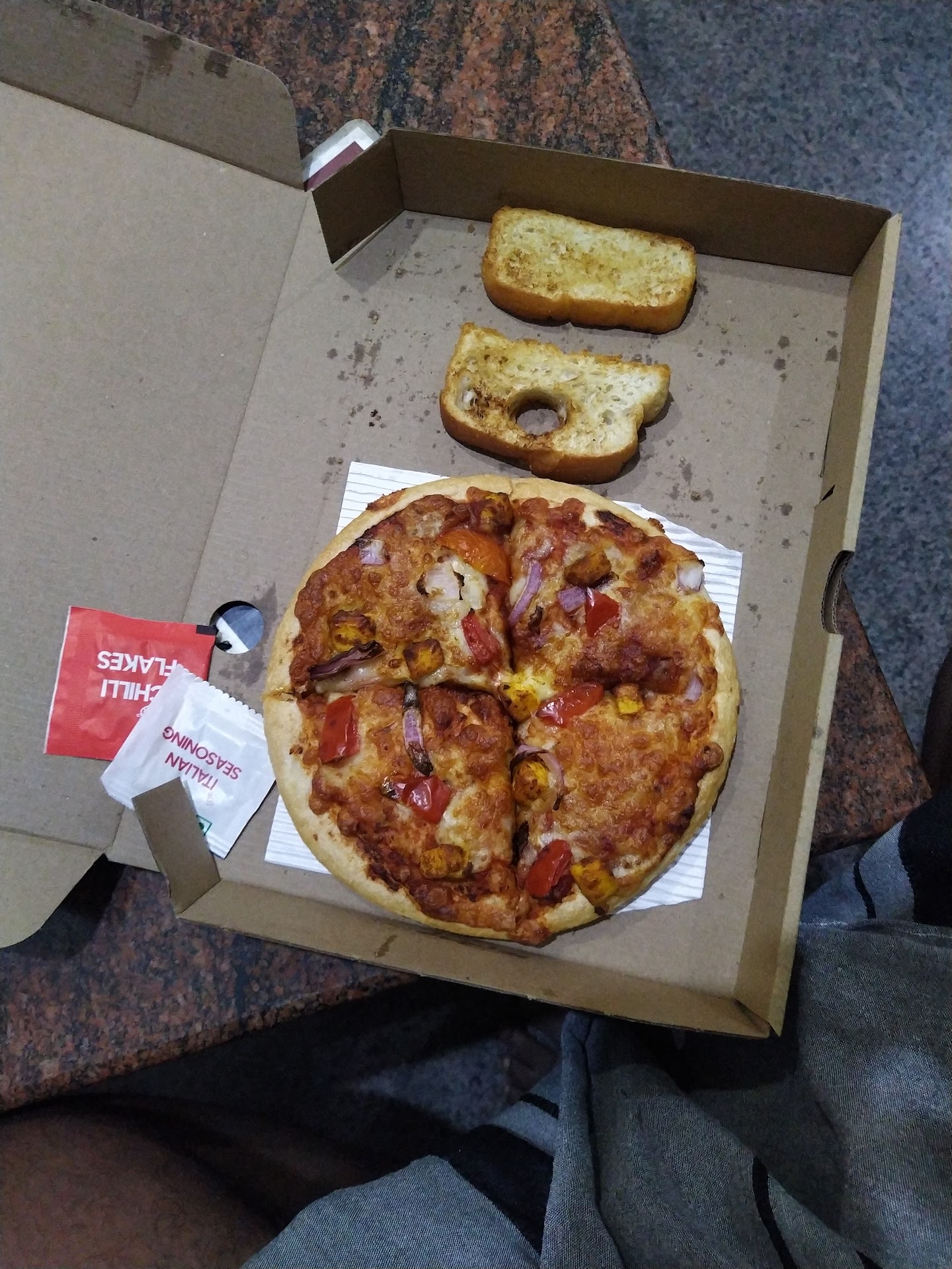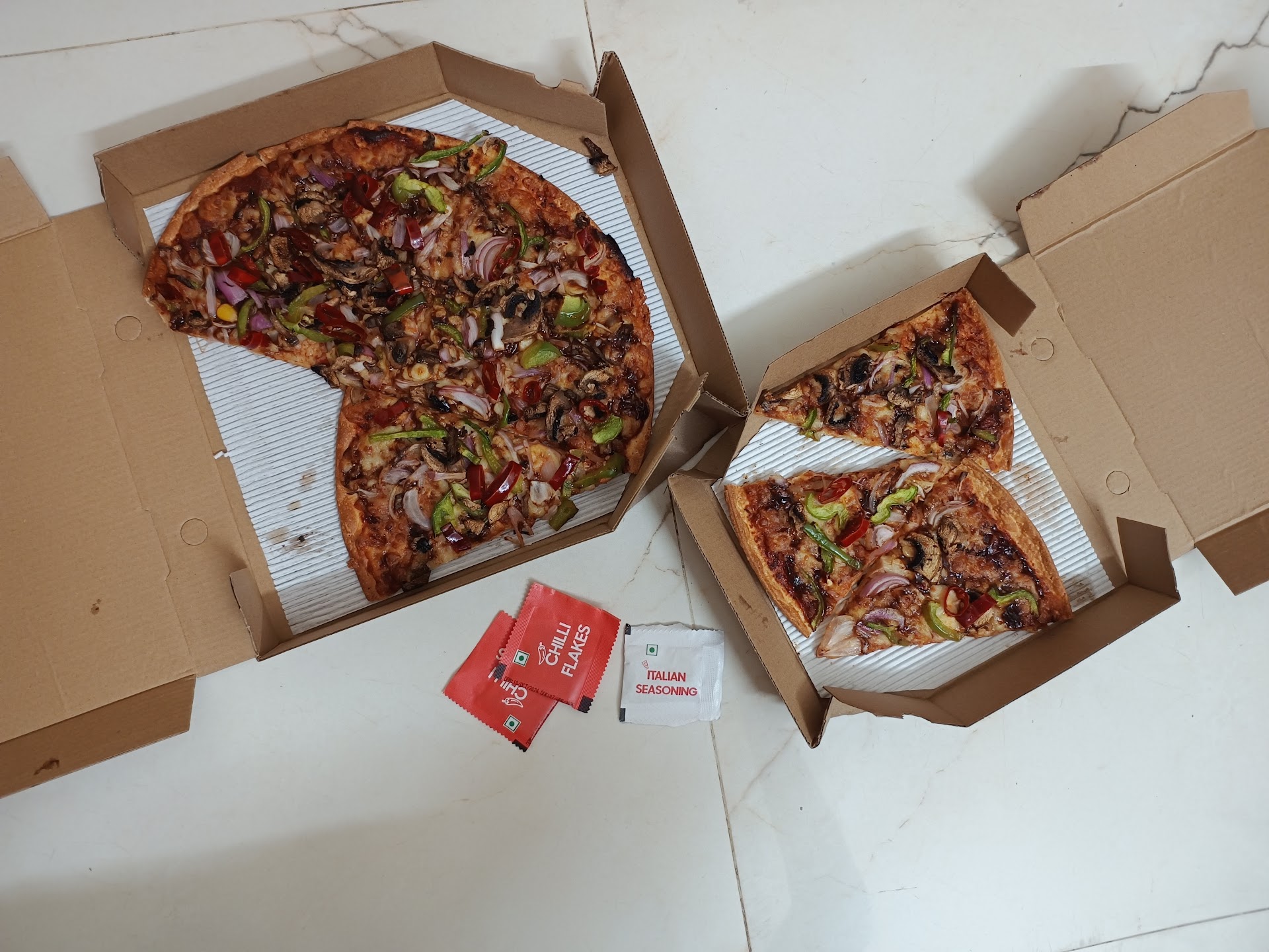 Not so good: Arrived cold despite being just 2km away Only got 1 oregano sachet and 2 chili flakes packets (no ketchup!) The "serves 4" claim is way off - 8 slices of thin crust barely filled up 2 of us for dinner