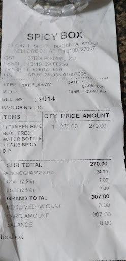A few minutes ago, I bought a Paneer Rice Box directly from The Spicy Box restaurant, paying ₹307 for just a 500ml portion. it's clearly priced with so-called premium charges.